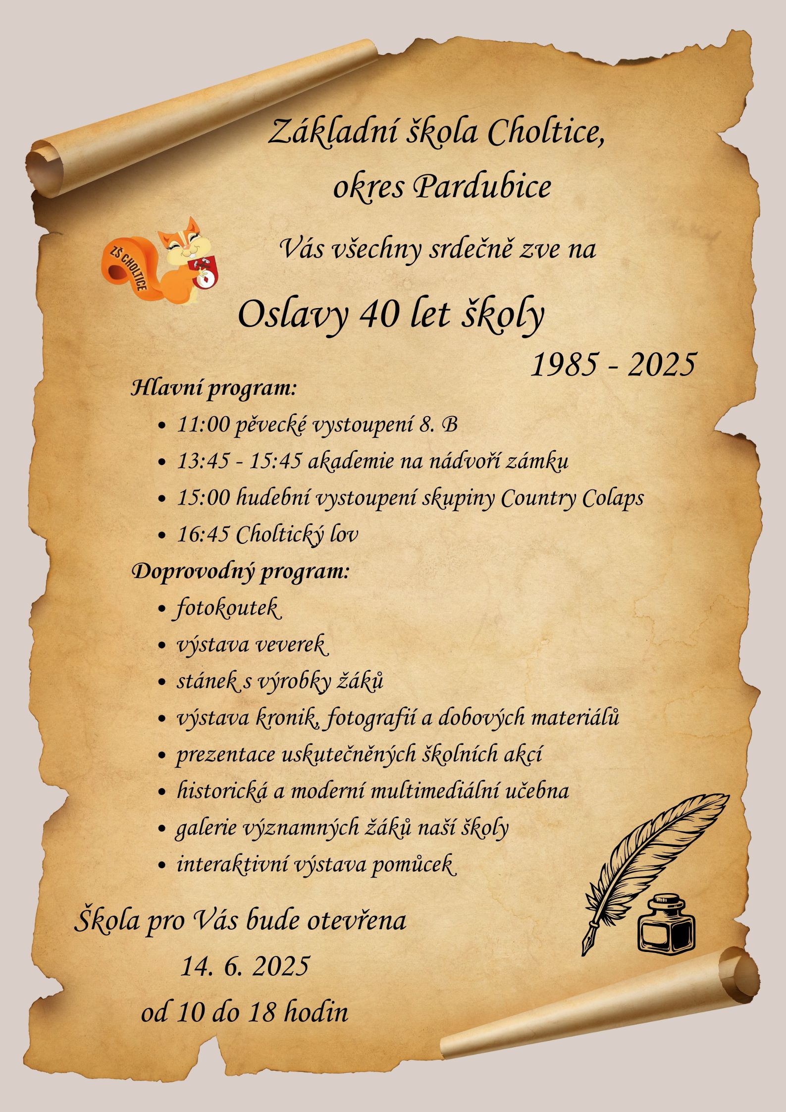 První školní den (1.9.2025) bude zahájen v 8:00 před budovou školy, kde proběhne slavnostní zahájení.